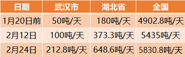 根据国家生态环境部最新公布的数据,截至2020年2月24日,武汉市医疗废物处置能力达到262.8吨/天、湖北省能力达到648.6吨/天、全国能力达到5830.8吨/天。仅2月24日当天,全国收集医疗废物总计2719.1吨,累计处置医疗废物98508.1吨(从1月20日起)。