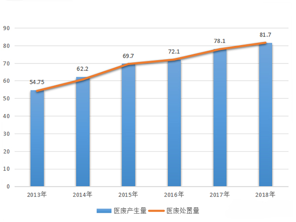 根据国家生态环境部2014年至2019年发布的《全国大、中城市固体废物污染环境防治年报》数据来看,我国医疗废物产生量一直处于平稳上升的状态,医疗废物的处置量也能随之上升,基本能够保持