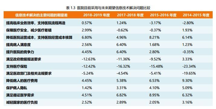 将2018-2019年度、2017-2018年度、2015-2016年度以及2014-2015年度医院目前采用与未来期望信息技术解决问题的期望差的调查数据进行对比。分析可见,医院希望利用信息技术更有力地去支持临床实践应用,同时减少一些支持医疗保险和满足医政部门及相关法规要求方面的压力。医院目前采用与未来期望信息技术解决满足政府数据报送要求、降低病人的医疗费用以及保护病人隐私问题的期望差逐年下降。详细数据见表1.3。