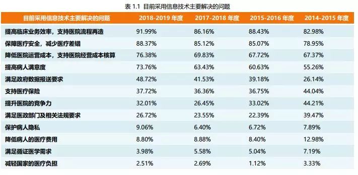 将2018-2019年度、2017-2018年度、2015-2016年度以及2014-2015年度医院采用信息技术主要解决的问题的调查数据进行对比。分析可见,排在前四位的是提高临床业务效率,支持医院流程再造、保障医疗安全,减少医疗差错、降低医院运营成本,支持医院经营成本核算和提高病人满意度。保障医疗安全,减少医疗差错、降低医院运营成本,支持医院经营成本核算、提高病人满意度、满足政府数据报送要求的比例逐年下降。详细数据见表1.1、图1.1。