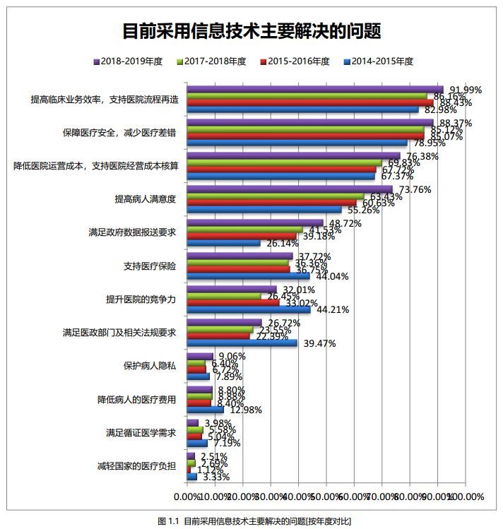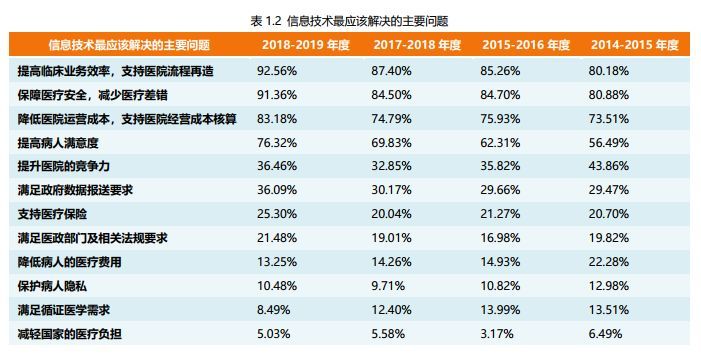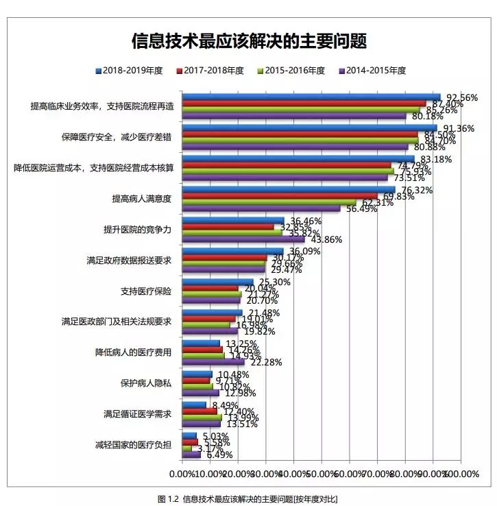 将2018-2019年度、2017-2018年度、2015-2016年度以及2014-2015年度医院使用信息技术最应该解决的主要问题的调查数据进行对比。分析可见,排在前四位的是提高临床业务效率,支持医院流程再造、保障医疗安全,减少医疗差错、降低医院运营成本,支持医院经营成本核算和提高病人满意度。提高临床业务效率,支持医院流程再造、提高病人满意度、满足政府数据报送要求的比例逐年下降。降低病人医疗费用的比例逐年上升。详细数据见表1.2、图1.2。