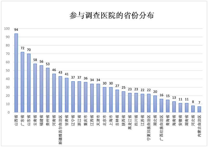 来自全国30个省级行政区的1014家医院参与了此次调查,排名前五的分别是山西(94 家)、广东(72 家)、山东(70家)、云南(58 家)、福建(56 家),详见图1-1。