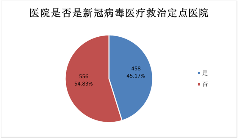 为有效控制新冠病毒的传播,加强救治工作,国家卫生健康委指定了新冠肺炎救治定点医院。参与此次调查对象中,有458人所在医院是新冠肺炎救治定点医院,占比45.17%,以反映出定点医院的信息化建设扩展和改造情况,如图1-4 所示。