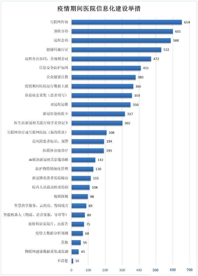 此外,还有很多医院开展了流行病学调查和患者发热调查、诊间支付、院感监控、病案邮寄服务、大数据分析追踪重点高风险患者、医联体远程查房等信息化举措。