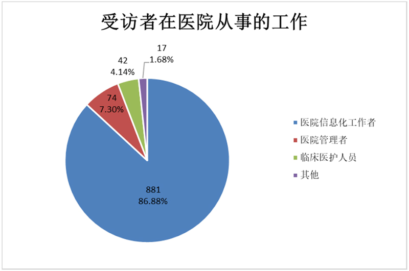 在此次调研中,医院管理者和医院信息化工作者是主要调查对象。其中,医院信息化工作者为881 人,占比为86.88%;医院管理者为74 人,占比7.30%;临床医护人员为42 人,占比4.14%;在医院担任其他职务者为17 人,占比1.68%,详见图1-3。