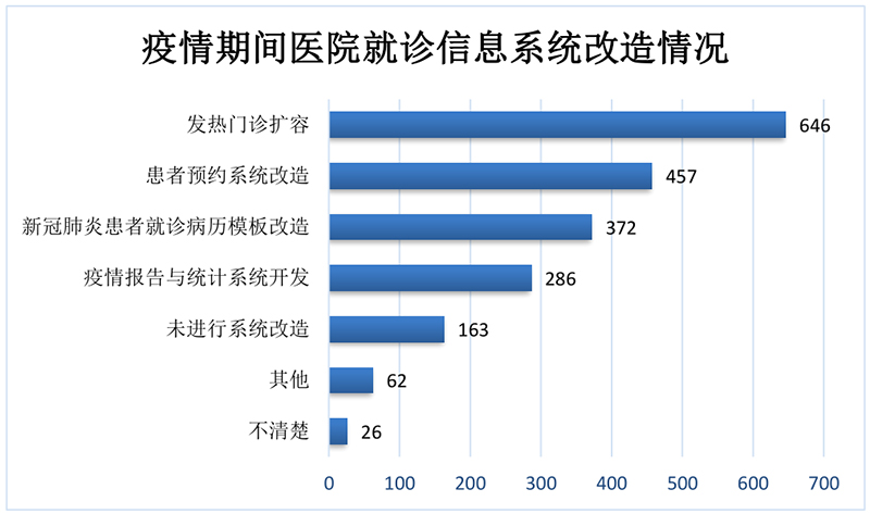 调查显示,调查对象所在医院在抗疫期间进行发热门诊扩容的为646,占比63.71%;开展患者预约系统改造的为457,占比45.07%;改造新冠肺炎患者就诊病历模板的为372,占比36.69%;开发疫情报告与统计系统的为286,占比28.21%;进行其他方面信息系统改造(比如医保信息标注、门急诊流程改造等)的为62,占比6.61%;未进行系统改造的为163,占比16.07%,详见图1-11。