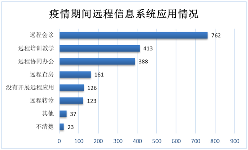762,占比75.15%;进行远程培训教学的为413,占比40.74%;进行远程协同办公的为388,占比38.26%;开展远程查房的为161,占比15.88%;进行远程转诊的为123,占比12.13%;开展其他远程应用(包括远程心电、远程诊断等)的为37,占比3.65%;没有开展远程应用的为126,占比12.43%,详见图1-10。