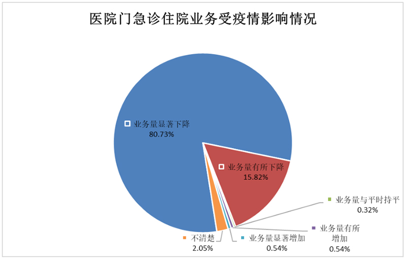 新型冠状病毒具有非常强的传染性,根据相关规定,很多医院的门急诊和住院重新进行了调整。共有929 位受访者回答了疫情期间医院门急诊、住院业务量受影响情况这一问题,数据显示,表示业务量显著下降的为750,占比80.73%;业务量有所下降的为147,占比15.82%;业务量有所增加和显著增加的都是5,占比0.54%;业务量与平时持平的为3,占比0.32%,详见图1-17。