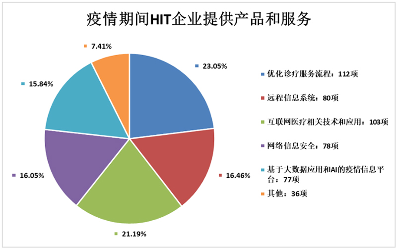被调查的HIT 企业提供的服务包括以下类型:优化诊疗服务流程共112 项,占比23.05%;远程信息系统共80 项,占比16.46%;互联网医疗相关技术和应用共103 项,占比21.19%;网络信息安全共78 项,占比16.05%;基于大数据应用和AI 的疫情信息平台共计77 项,占比15.84%;其他共计36 项,占比7.41%,详见图2-1。