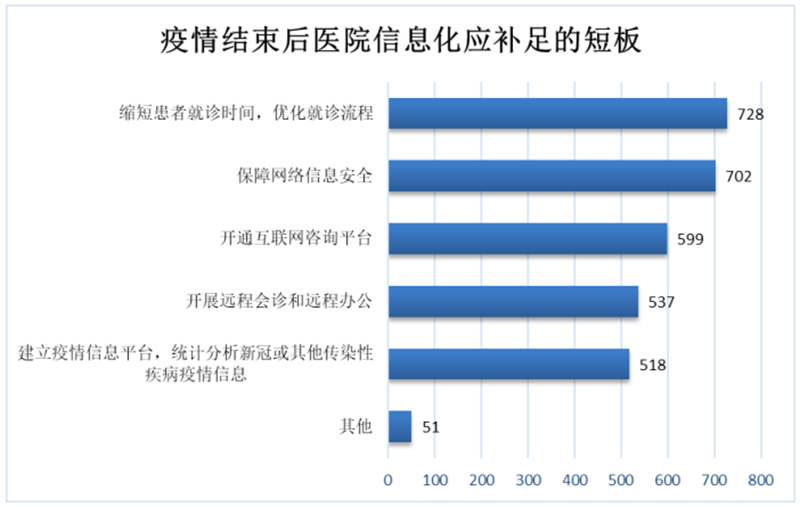 调查显示,认为疫情结束后需缩短患者就诊时间并优化就诊流程的为728,占比71.79%;认为需保障网络信息安全的为702,占比69.23%;认为需开通互联网咨询平台的为599,占比59.07%;认为需开展远程会诊和远程办公的为537,占比52.96%;认为需建立疫情信息平台,统计分析新冠或其他传染性疾病疫情信息的为518,占比51.08%;认为需补足其他短板(包括无纸化、灵活性设置架构等)的为51,占比5.03%,详见图1-15。