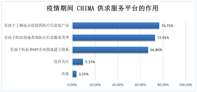 对于疫情期间医院信息化供求平台发挥的作用,CHIMA也针对医院用户进行了调查。认为有助于了解抗击疫情的医疗信息化产品的为799,占比76.75%;认为有助于快速查询医疗信息服务类型的为759,占比72.91%;认为有助于医院和HIT 企业快速建立联系的为696,占比66.86%,如图2-7所示。