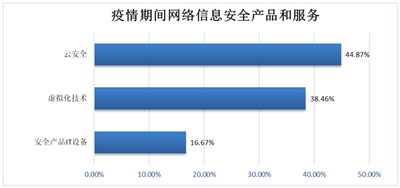 在网络信息安全方面,疫情期间市场上的网络信息安全产品和服务共78 项,占比16.05%,包括云安全、虚拟化技术和安全产品IT 设备。其中,云安全35 项,占比44.87%;虚拟化技术30 项,占比38.46%;安全产品IT 设备13 项,占比16.67%,如图2-4 所示。