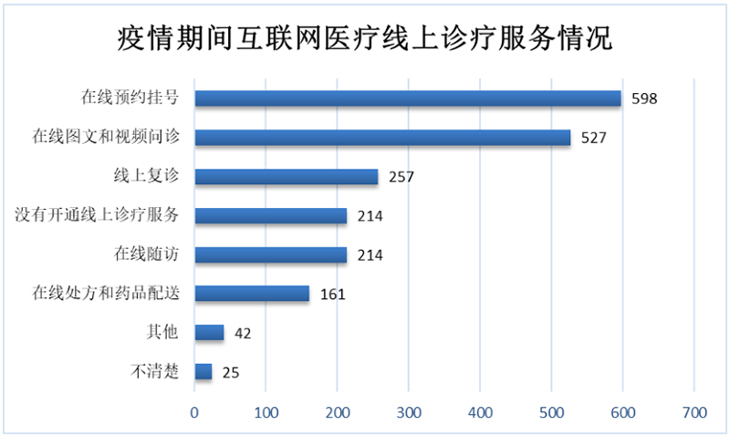 在抗击疫情的紧要关头,国务院、国家卫生健康委、国家医保局连续下发通知(后附),要求各地利用好互联网资源,通过互联网医院进行在线问诊、在线开具处方等,推动互联网医疗成为抗击疫情的“第二战场”。调查显示,医院开展的互联网医疗服务中,在线预约挂号为598,占比58.97%;在线图文和视频问诊为527,占比51.97%;线上复诊为257,占比为25.35%;在线随访为214,占比21.1%;在线处方和药品配送为161,占比为15.88%;没有开通线上诊疗服务的为214,占比21.1%;开展其他线上诊疗服务(包括居家照护、线上查询报告等)的为42,占比4.14%,详见图1-8。