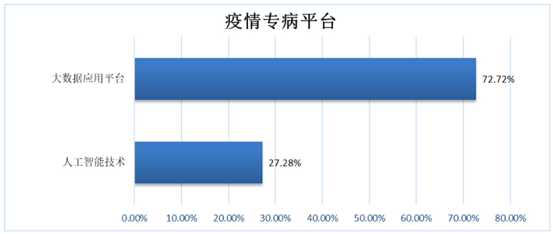 在新兴技术方面,疫情期间共提供了基于大数据应用和人工智能技术的疫情专病平台77 项,占比15.84%。其中,大数据应用平台56 项,占比72.72%;人工智能技术21 项,占比27.28%,如图2-5 所示。