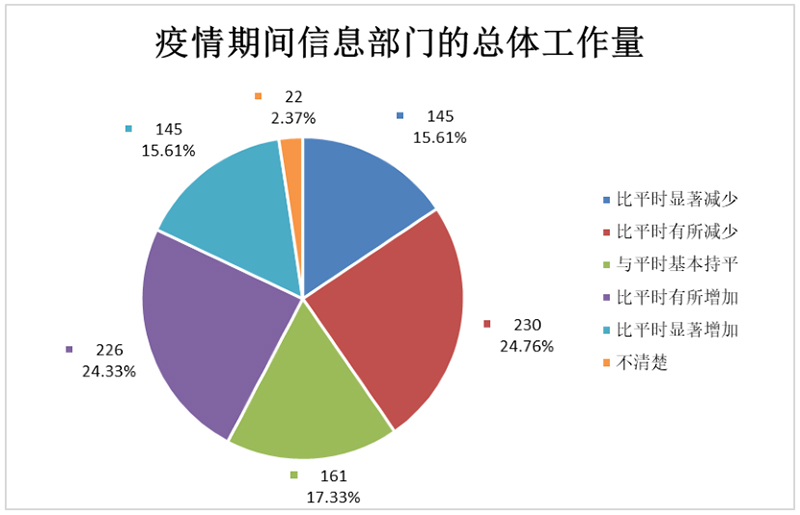 抗疫期间,医院信息部门的工作量的情况差异明显。共有929 位受访者回答了医院信息部门的工作量这一问题,数据显示,信息部门工作量比平时有所减少的为230,占比24.76%;工作量比平时有所增加的为226,占比24.33%;工作量与平时基本持平的为161,占比17.33%;工作量比平时显著增加的为145,占比15.61%;工作量比平时显著减少的为145,占比15.61%,详见图1-18。