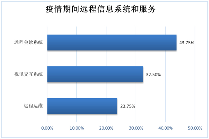 在远程应用方面,调查到的远程信息系统和服务共80 项,占比16.46%,涵盖远程会诊系统、视讯交互系统、远程运维等。其中,远程会诊系统35 项,占比43.75%;视讯交互系统26 项,占比32.50%;远程运维19 项,占比23.75%,如图2-3 所示。