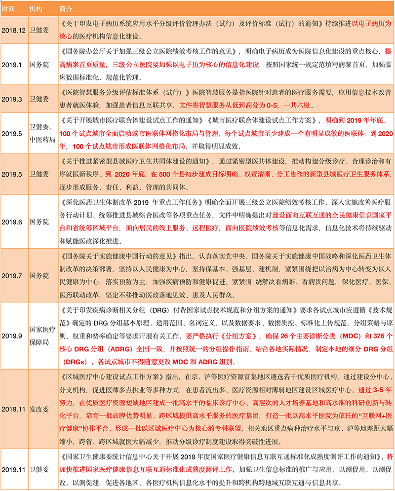 回顾政策,从2018年12月起,我们能够看到国家对于医院信息化建设重视程度的逐日提升,这种重视不仅表现在对于电子病历、智慧医院、DRG等院内信息化的建设,还提及了医联体、新型县域医疗卫生服务体系等模式建设。