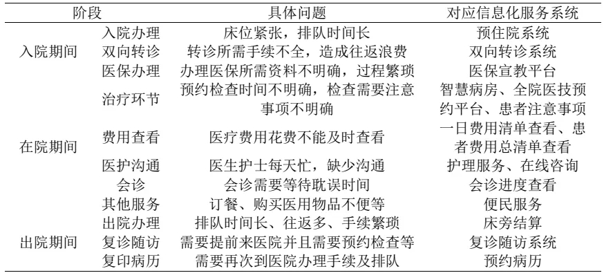 基于前述患者住院服务需求调研结果,依托信息化技术手段,以患者身份证号为主索引,建立患者电子健康二维码,基于互联网+医疗,实现医院内线上线下全流程的住院信息化服务体系。将信息化在线住院服务功能贯穿患者从入院到出院的整个住院阶段。见表1。