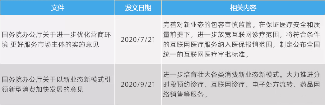 2-3月,在疫情防控的紧急状态下,国家卫健委两次发文,鼓励互联网医院、互联网诊疗服务,以降低线下就诊交叉感染风险。国家医保局将符合条件的“互联网+”医疗服务费用纳入医保支付范围,鼓励定点医药机构提供“不见面”购药服务。