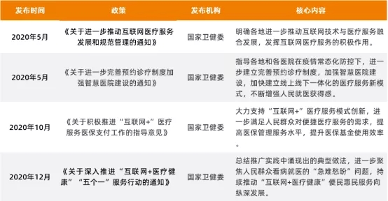 其次是政策的积极引导。自2020年2月以来,以国家卫健委为主导的职能部门相继出台多项政策,大力助推互联网医疗服务,鼓励患者向线上转诊,政策主要以“诊断、治疗、用药、送药、支付”五大核心医药价值链条切入,逐步完善线上服务。