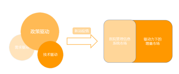 总的来说,新阶段下,医院管理系统发展的驱动力扩散为政策驱动、环境驱动、技术驱动、需求驱动四个方向,政策驱动占据主要地位,技术驱动带动需求驱动,环境驱动在整个过程中起到催化剂的角色。