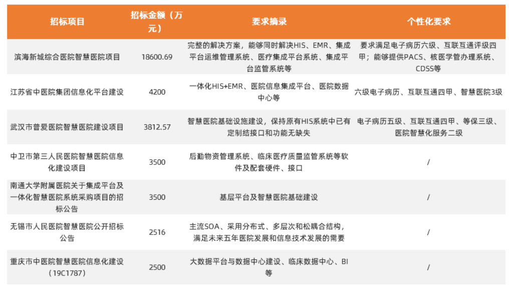 上述38个标的之中,58%的标的位于1000万元内这一区间,从招标文件来看,这一部分标的主要聚焦于单一HIS购置或集成平台搭建;39%的标的位于1000万元-1亿这一区间,其中又以1000-2000万居多,这一部分在购置HIS的同时,通常会伴随电子病历评级、互联互通评级、智慧医院评级、大数据中心建设。