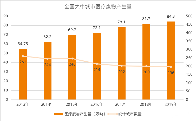 随着医疗服务量增长,以及一次性医疗用品和耗材的广泛应用,近年来我国医疗废物数量也在逐年增长。