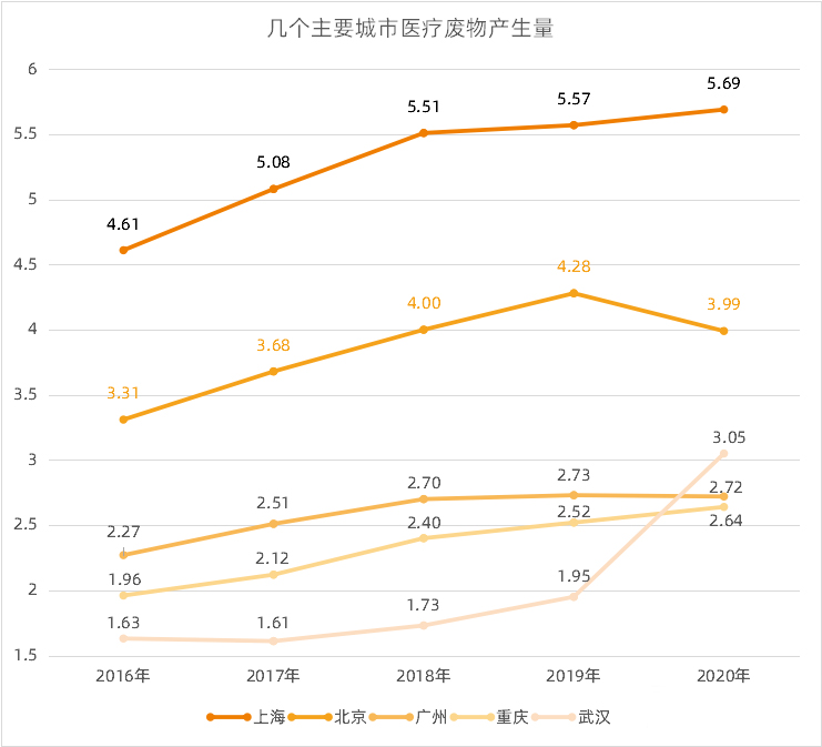 单个城市的变化情况能清晰地佐证整体趋势。同样是《全国大、中城市固体废物污染环境防治年报》显示,上海、北京、广州、杭州、成都、重庆等城市的医疗废物产生量,在历年均排于前列。梳理几个重点城市近5年来的数据可以发现,除了北京、广州在2020年略有下降之外,其他城市均处于增长状态。其中,武汉2020年增幅最大,主要是因疫情防控、新冠肺炎患者救治所致。北京和广州的医疗废物产生量减少,则与疫情期间医疗服务量下降有关。