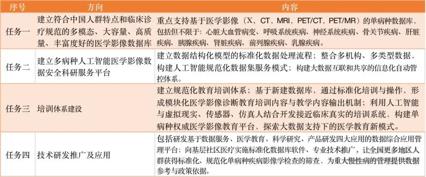 据重大疾病医学影像数据库建设项目实施方案所述,项目建设期为5年,分三个阶段开展。第一阶段为签约日起-2022年12月底,是标准建立期;第二阶段为2023-2025年,是数据平台建设期;第三阶段为2025-2027年,是开发应用期。具体而言,第一阶段将建立基于部位或器官疾病的医学影像单病种或多病种图像采集规范与识别标准,图像分割与标注标准,相关数据库建设标准共识;建立数据建设技术队伍,搭建数据库技术和管理平台。完成标准制定之后,更为重要的是第二阶段建设。该阶段的任务可分为建立符合中国人群特点和临床诊疗规范的多模态、大容量、高质量、丰富度好的医学影像数据库;建立多病种人工智能医学影像数据安全科研服务平台;培训体系建设;技术研发推广及应用四个方面。